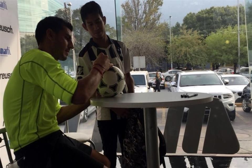 Portero de Tigres convive con aficionados felinos en firma de autógrafos en la que lo sorprende fan del Monterrey.